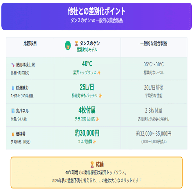 40℃環境での安定動作、25L/日の除湿性能、移動可能な利便性——これらの特徴は、現代のライフスタイルにぴったりマッチしています。