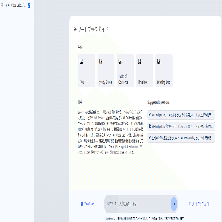 URLを挿入してサイトを追加すると、画面左上に追加された資料がリスト化されます。その後、Geminiが自動的に内容を参照して概要をまとめ、さらにおすすめの質問を提案してくれます。