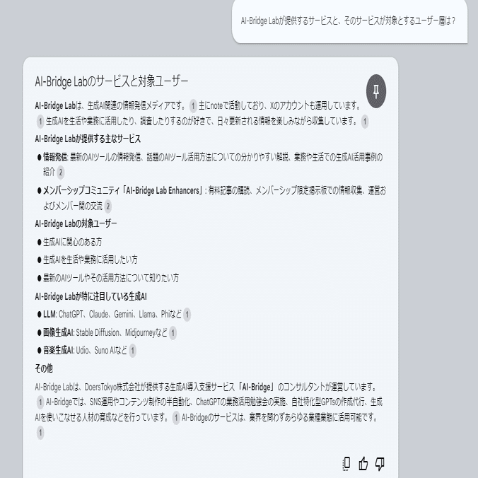 「AI-Bridge Labの特徴を教えて」などの質問にも完璧な精度で回答ができており、Geminiの検索能力の高さが伺えます。媒体のコンセプトを第三者に分かりやすく伝えるための台本にそのまま使えるレベルです。