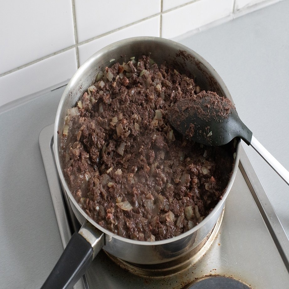 しばらく火を通していくと、固形だったブラッドソーセージがだんだん溶けていきました。