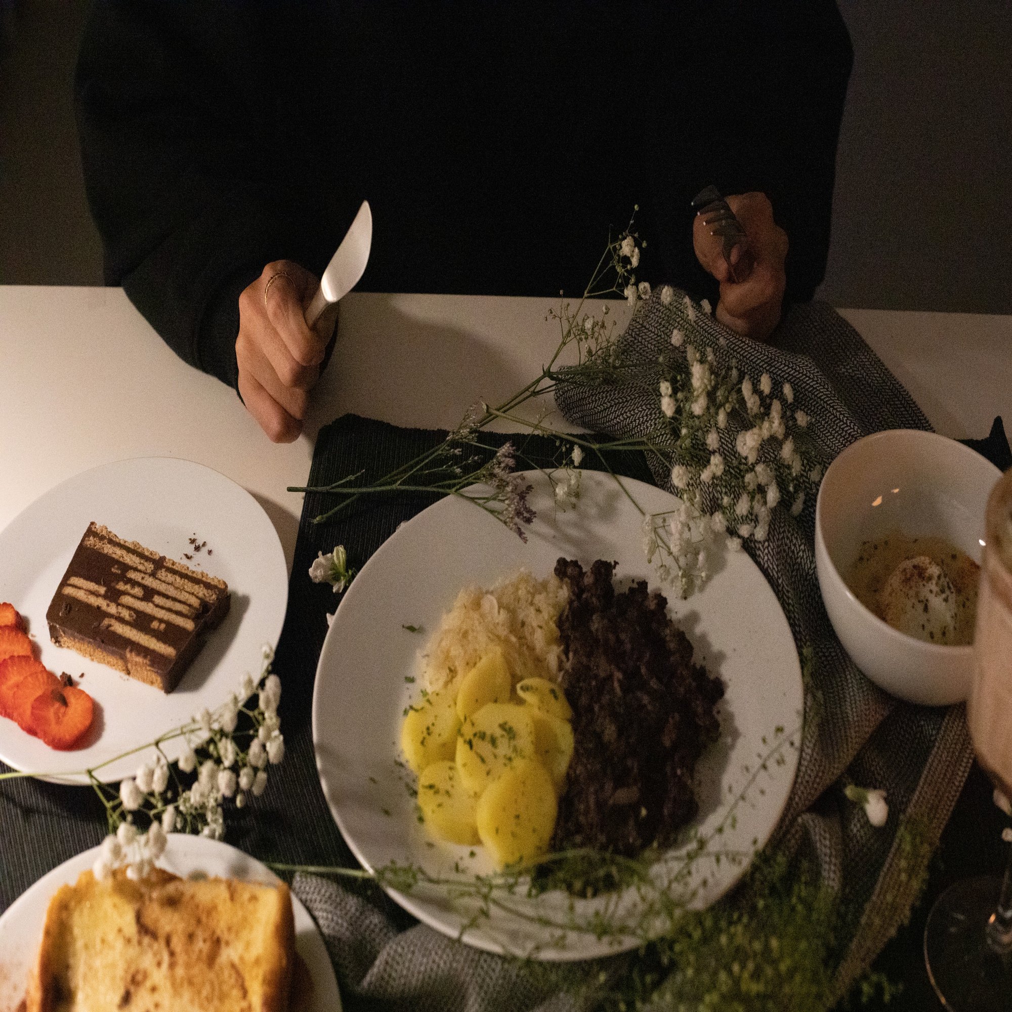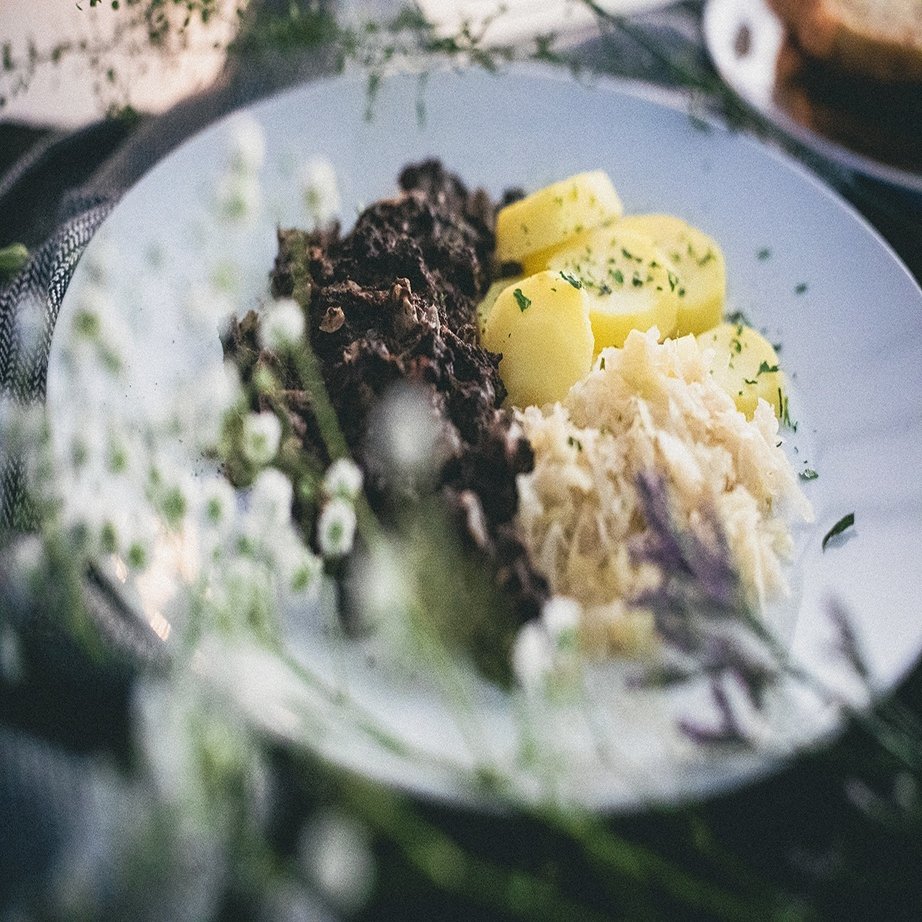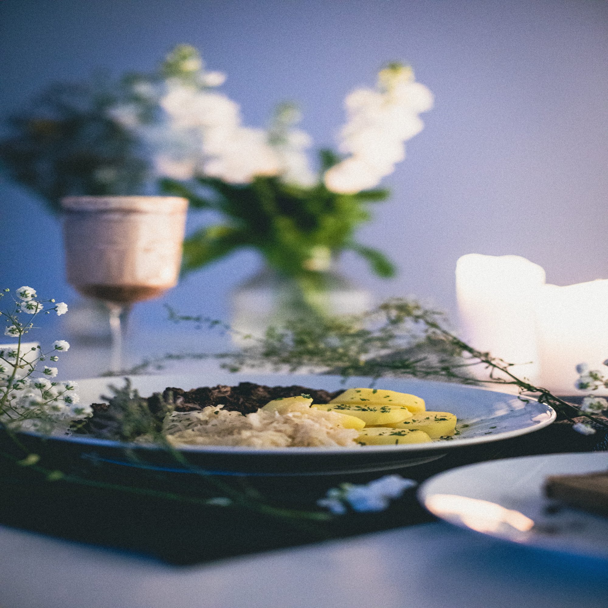 あとはこちらをザワークラウトやじゃがいもと一緒に盛り付けるだけなのですが、これだけでは見た目が素朴すぎるので、ちょっとテーブルアレンジに凝ってみることにしました。