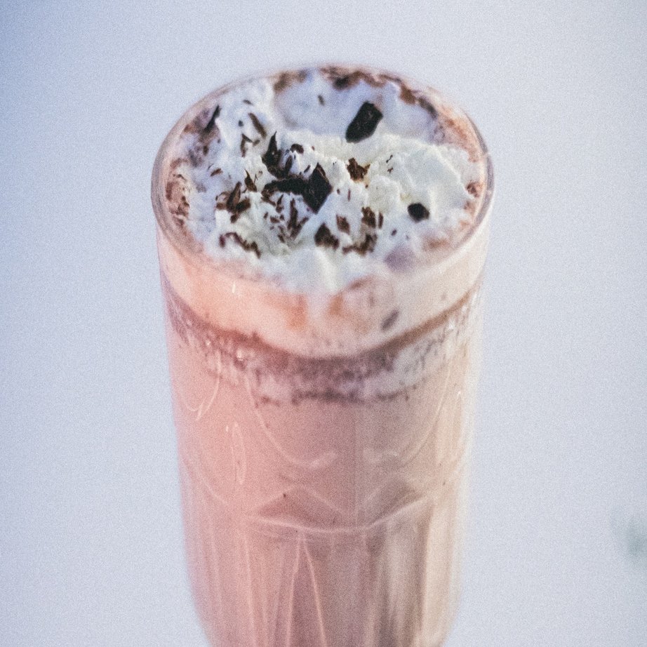 作り方:沸かした牛乳にビターチョコレートを溶かし、ラム酒で香りをつけたものをグラスに注ぎ、クリームを浮かべる。
