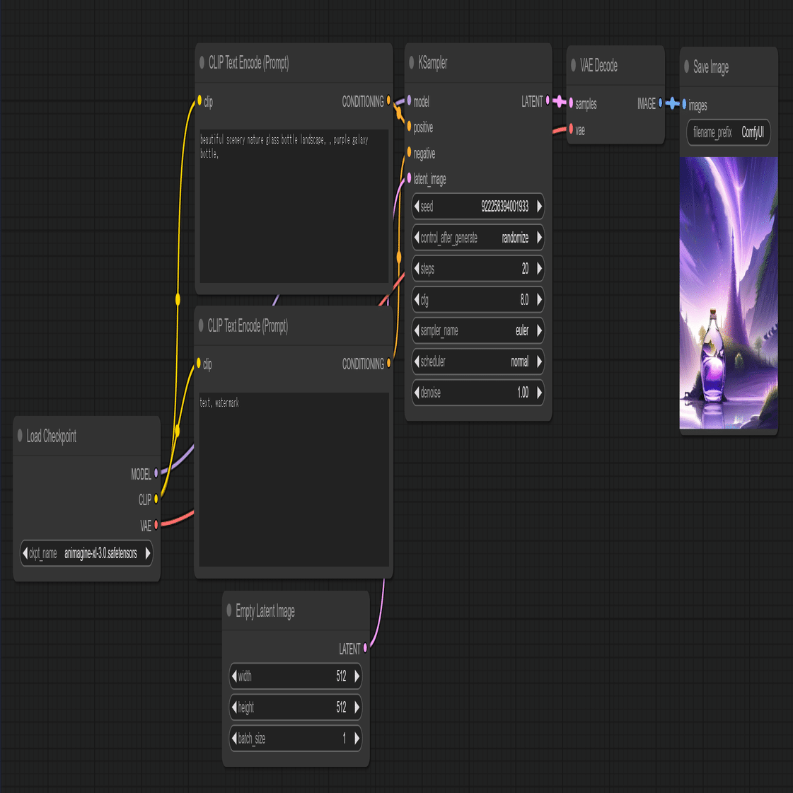一方、ComfyUI は画像生成に必要な機能を「ノード」という形で分離し、ユーザーは自分で好きなようにノード同士を連結して機能と機能をつなげながらパラメータを入力し、画像を生成させる。
