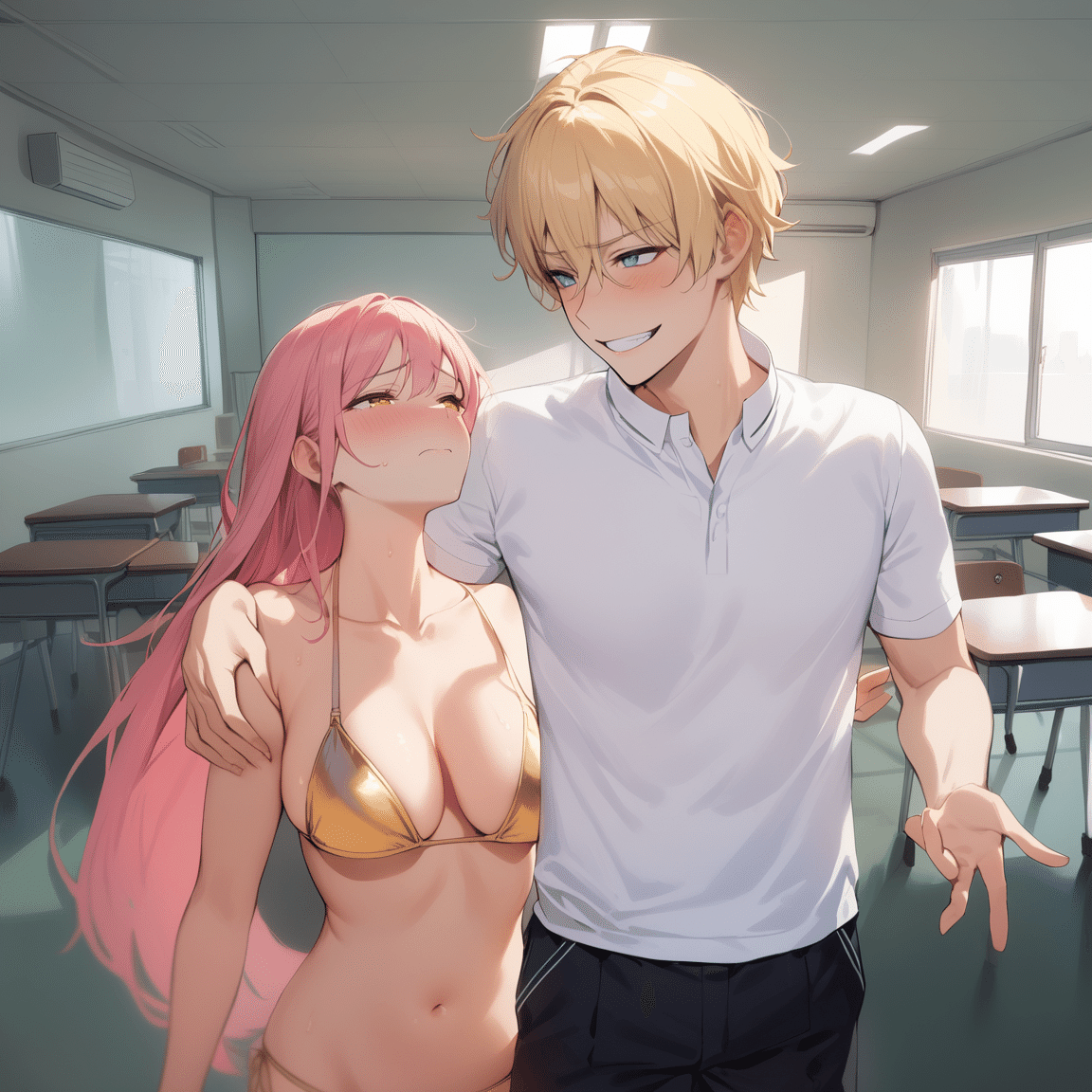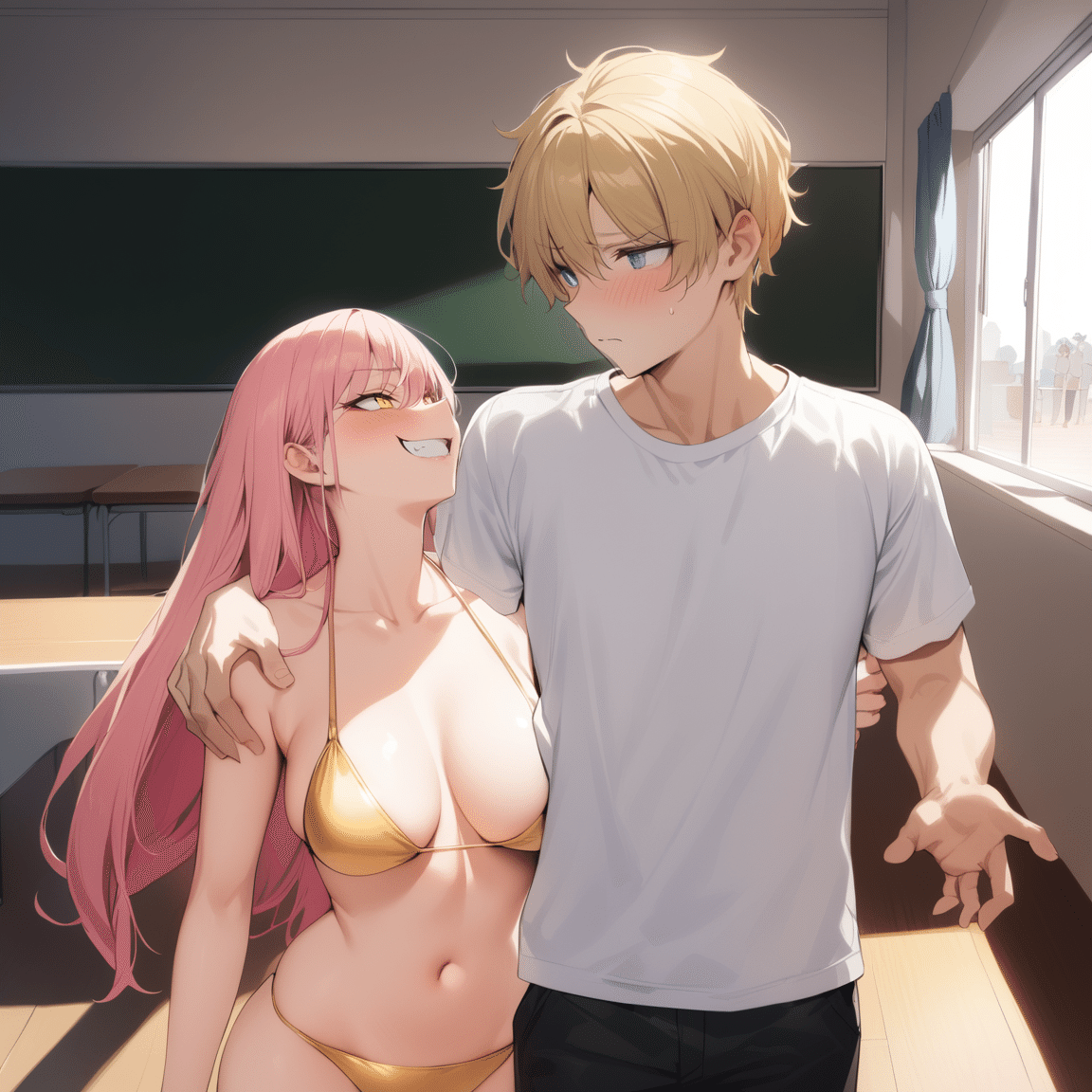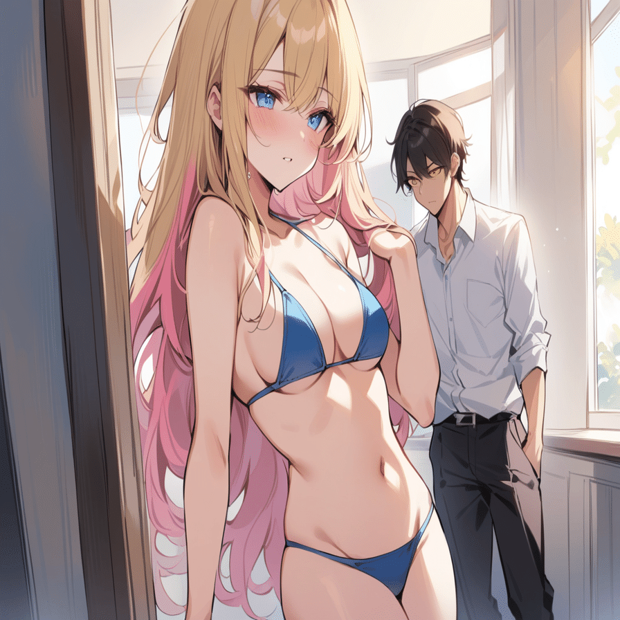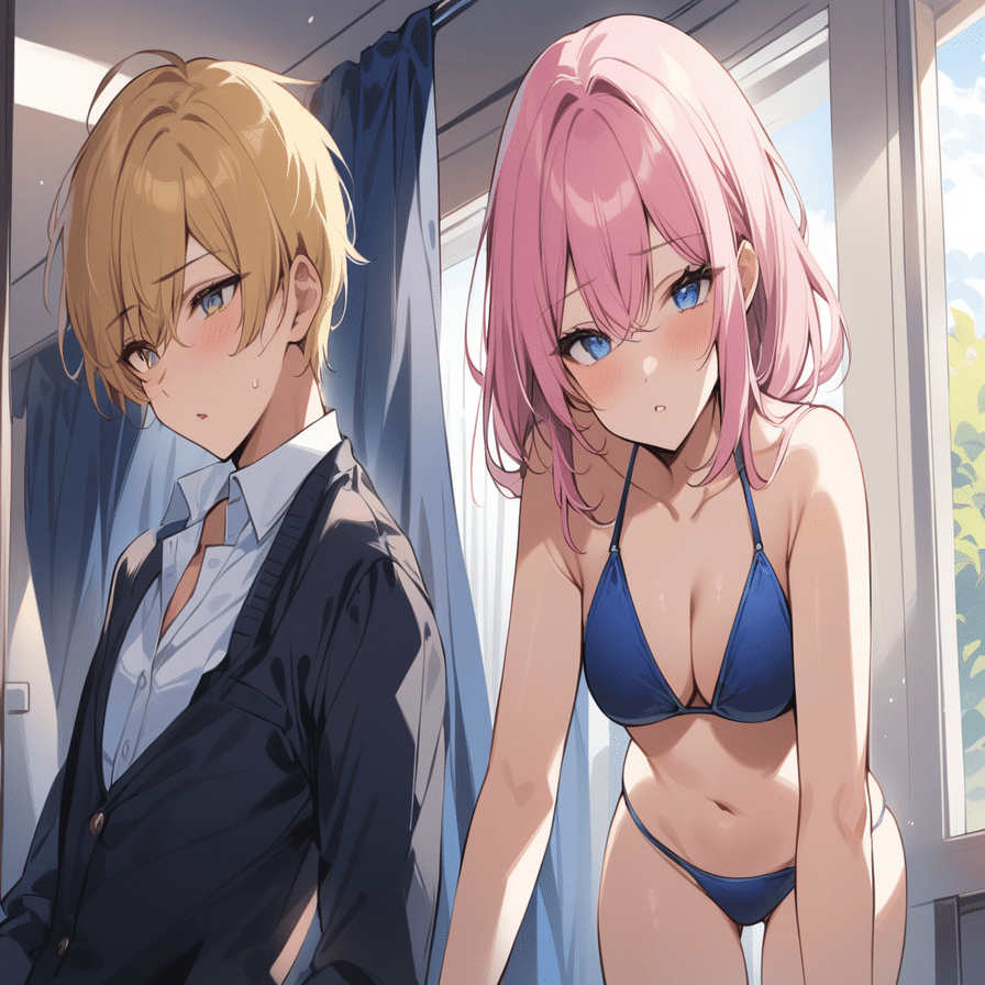 先ほどまでの例に挙げたコンセプト(女の子=ピンク髪、金目、ビキニ+男の子=金髪+青目+学生服)も、このワークフローを使うと、以下のような絵として生成出来る。