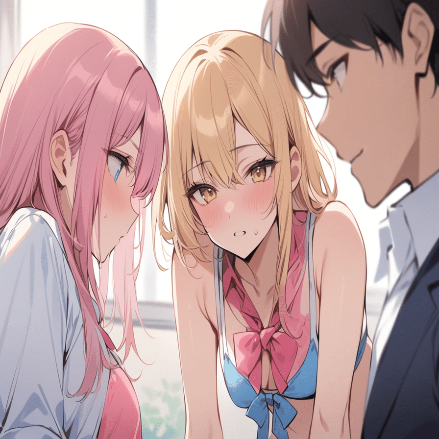 今回はさらに、女の子はいじわるな顔(evil smile + grin)で金色ビキニ、男の子は恥ずかしがっている(shy)のプロンプトに追加し、完全にキャラごとに表情も異なっている事が分かるようにした。