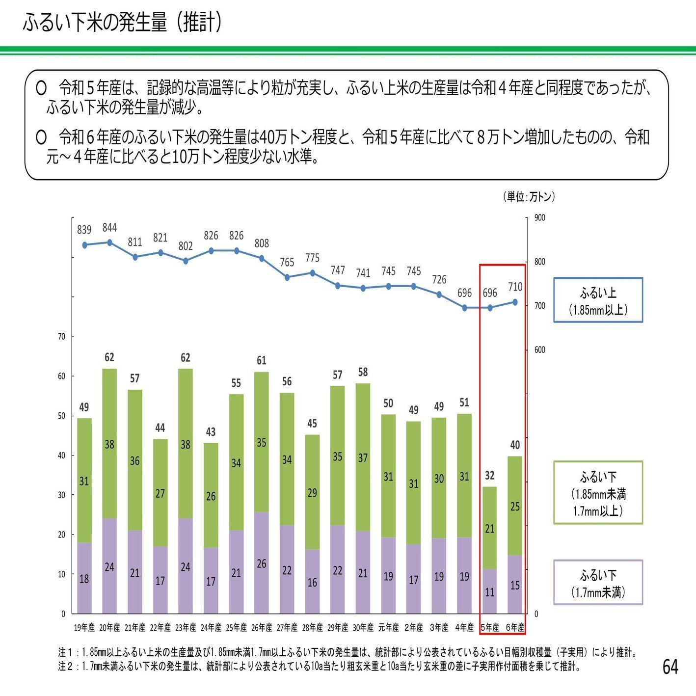 原因は、2年とも猛暑でコメが大粒になったこと、品種をコシヒカリとは別のものに切り替えて大粒になりやすかったこと、などがあるらしい。網を通過しなかった大粒の網上米はそれなりの量(平年並み)がとれたようなのだけれど、網下米がえらく減った。2年で約30万トンの不足(図1)。