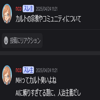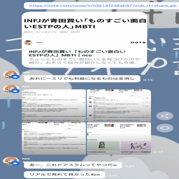 他人の名前をもじって「みじめ」と呼ぶとか、中傷の標的どうしを性的に揶揄するdiscordの書き込みを嬉々として動画にしたりとか、自分自身が散々っぱら人を中傷していたのに、やりかえされるとAIに頼み込んで記事を連発しちゃうのも可愛らしいんこ。ずっとPCの前に貼り付いて愛ちゃん(※nco氏がAIに名付けた愛称♥)にかまってもらってる姿を想像しちゃったんこ。