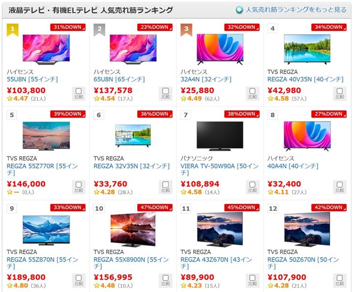 姉妹ブランドであるTVS REGZAとハイセンスの製品に人気が集まっています。mini LEDバックライト+タイムシフトマシン(全録)の高機能を揃えた「55Z870N」、32V型ではレアなフルHDモデル「32A4N」、フルHDの40V型「40V35N」、mini LEDバックライト搭載機を手ごろな価格で購入できる「65U8N」「55U8N」と幅広いキャラクターのこれらは定番化していると言えるでしょう。