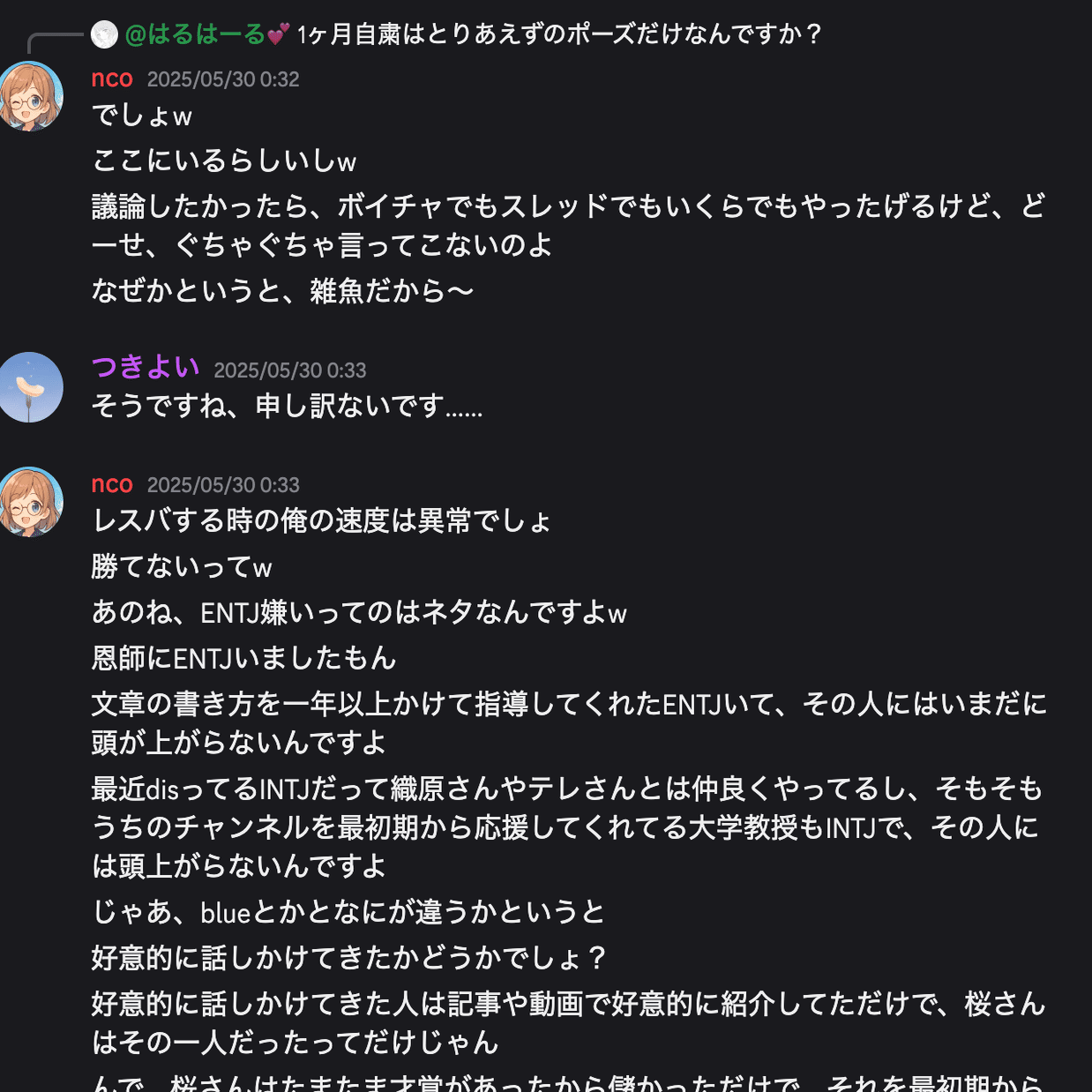 私は、ncoさんがdiscordでコミュニティを形成して、blueさんをはじめとする多くの良心的なMBTIファンを馬鹿にし、場合によってはいじめているということを広められたらそれでいいの。