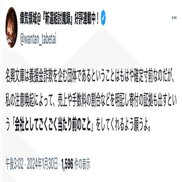 本件投稿には「名興文庫は義援金詐欺を企む団体」とあり、債権者が行なっている批評販売を「義援金詐欺」としている。債権者は詐欺を行うつもりはなく、一定期間の売り上げを全額寄付するつもりで批評販売を実施した。
