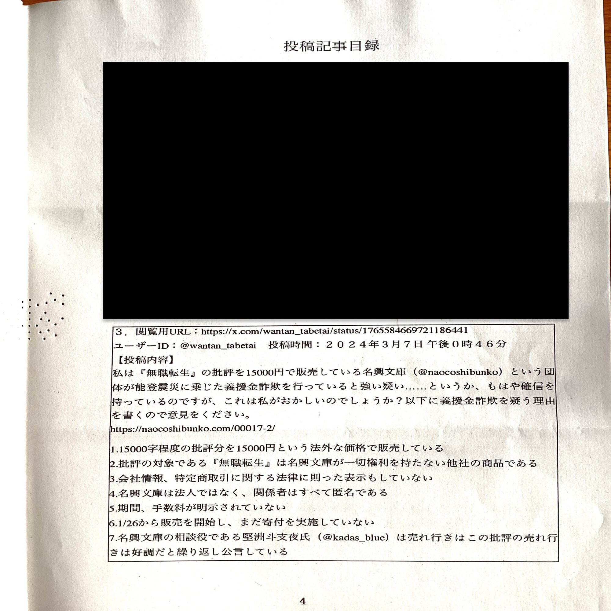 4であるが、名興文庫は現在事業規模が小さいため、個人事業の体を成している。法人格を有していなければ商売をしてはいけないということになれば、世の中の個人事業主は全員商売を行ってはならないということとなり、あまりにも非常識な意見である。名興文庫の事業に参加しているメンバーが全員匿名であるのは、名興文庫に対して行われた誹謗中傷・名誉毀損・プライバシー侵害などの危険をあらかじめ予想していたからである。瘴気領域(@wantan_tabetai)は申立人に対し、誹謗中傷・名誉毀損・プライバシー侵害を行なっており、開示請求手続きにて申立人の主張は認められている。