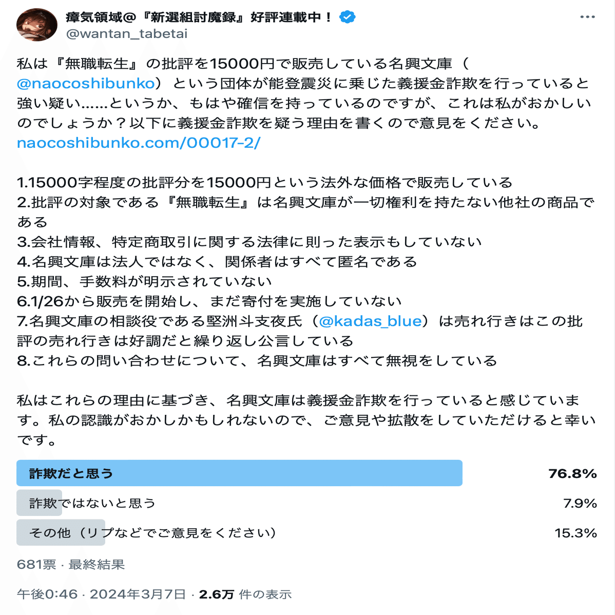 本件投稿のアンケートが行われたことにより、名興文庫の義援金活動を「詐欺だと思う」と考える割合が76.8%にも達した。また、本件投稿は申立人が観測した時点でインプレッションが2.6万にも達している。