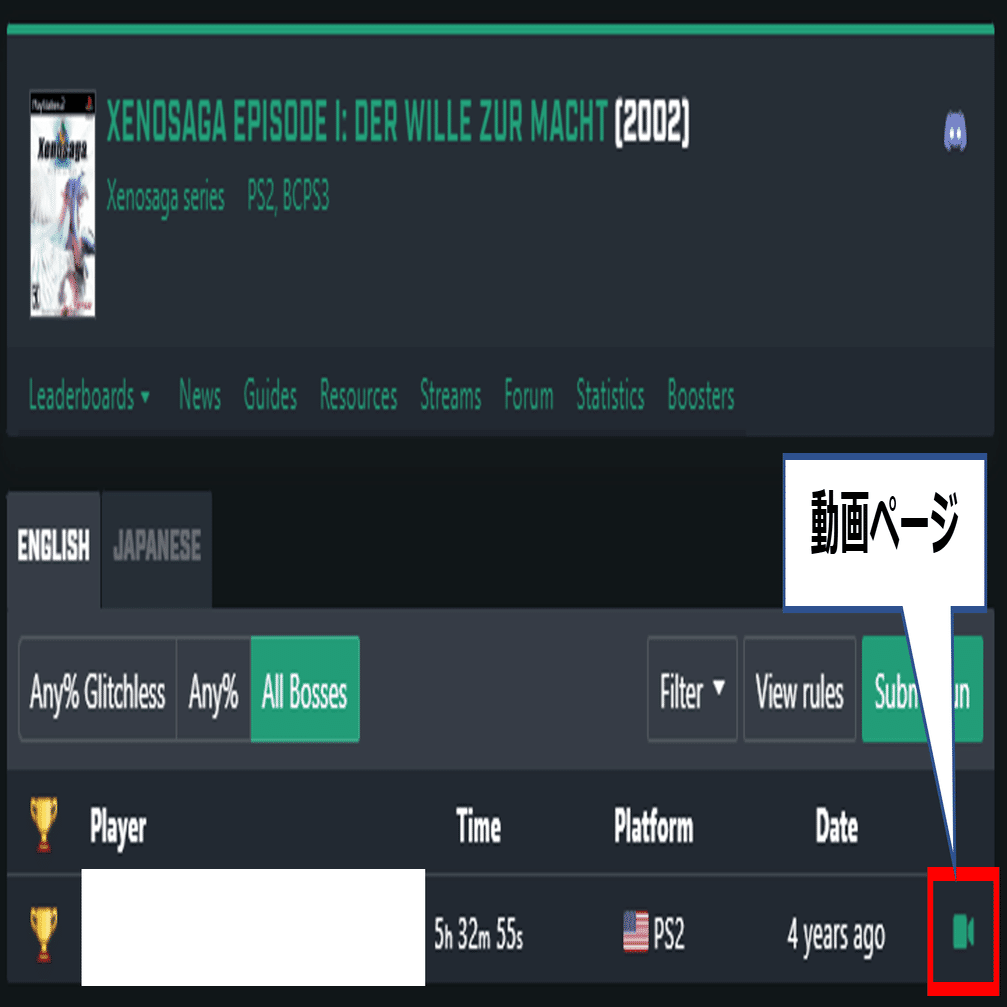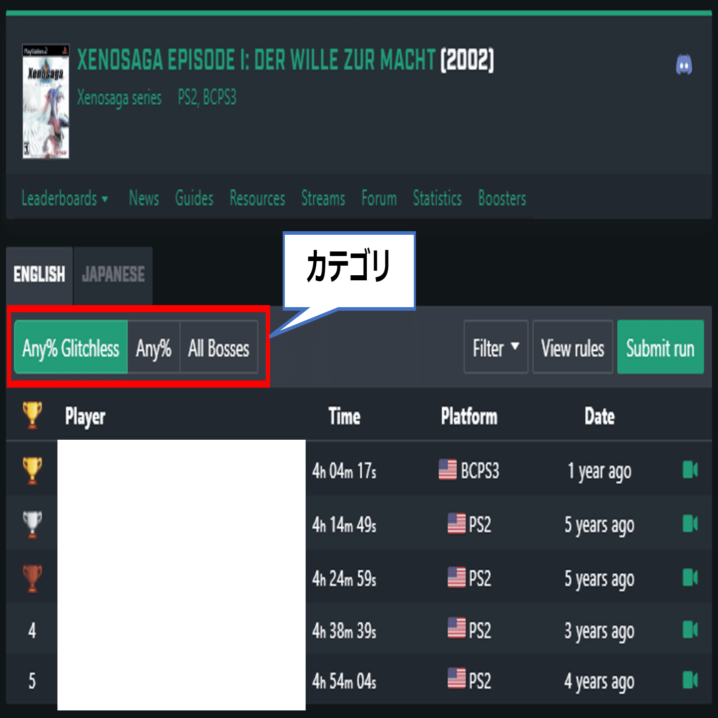 ゼノサーガ エピソード1の場合、「Any% Glitchless」「Any%」「All Bosses」の3つのカテゴリがあるということが分かります。