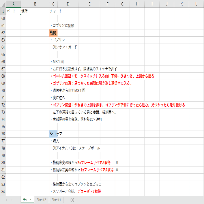 私は長時間RTAが多いこともあり、完全に覚えられずプレイ中に横目でチャートを見ることが多いので、見やすいように色分けなどができるという理由で、Excelに記載しています。