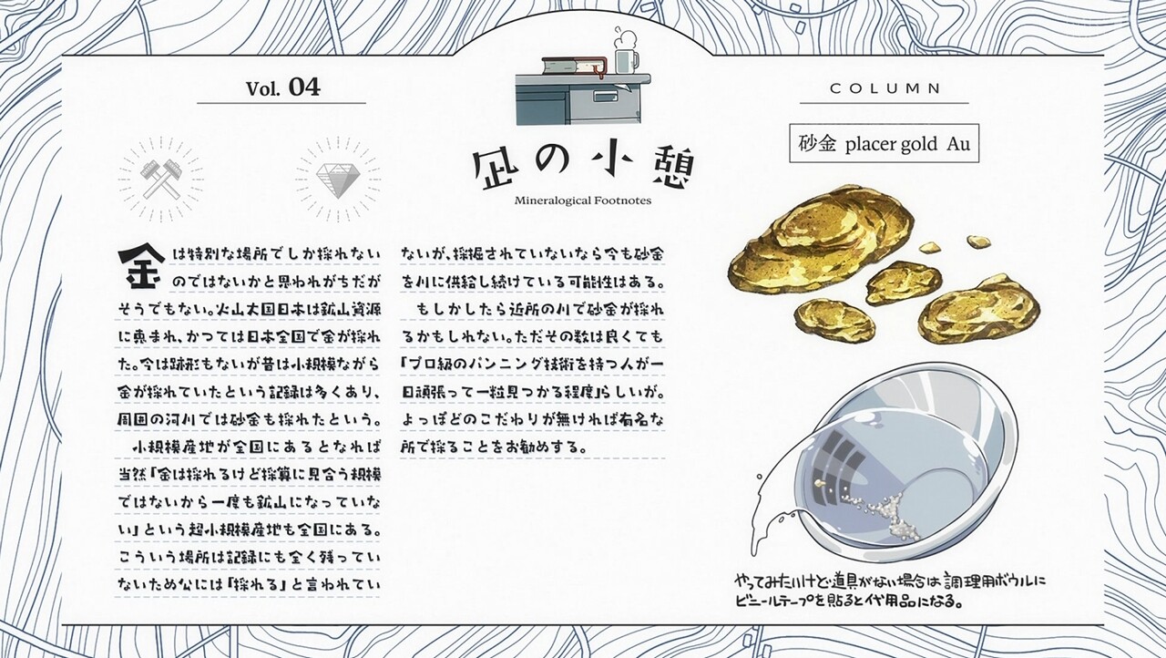 ただしコラムのコーナーでは埼玉でやってる砂金体験のイベント名とかが原作に載ってる