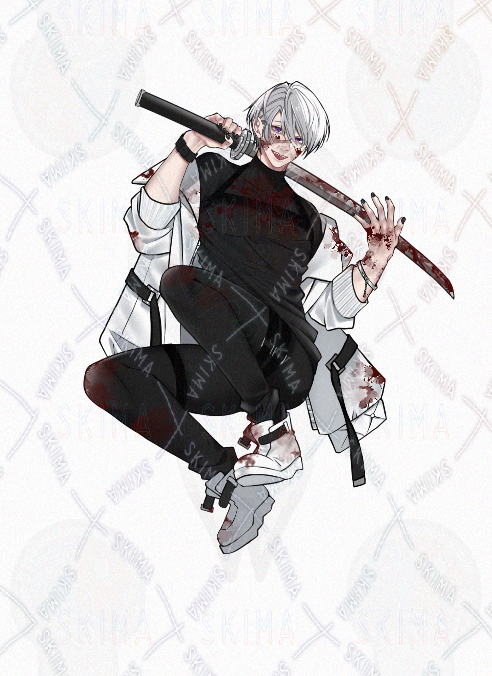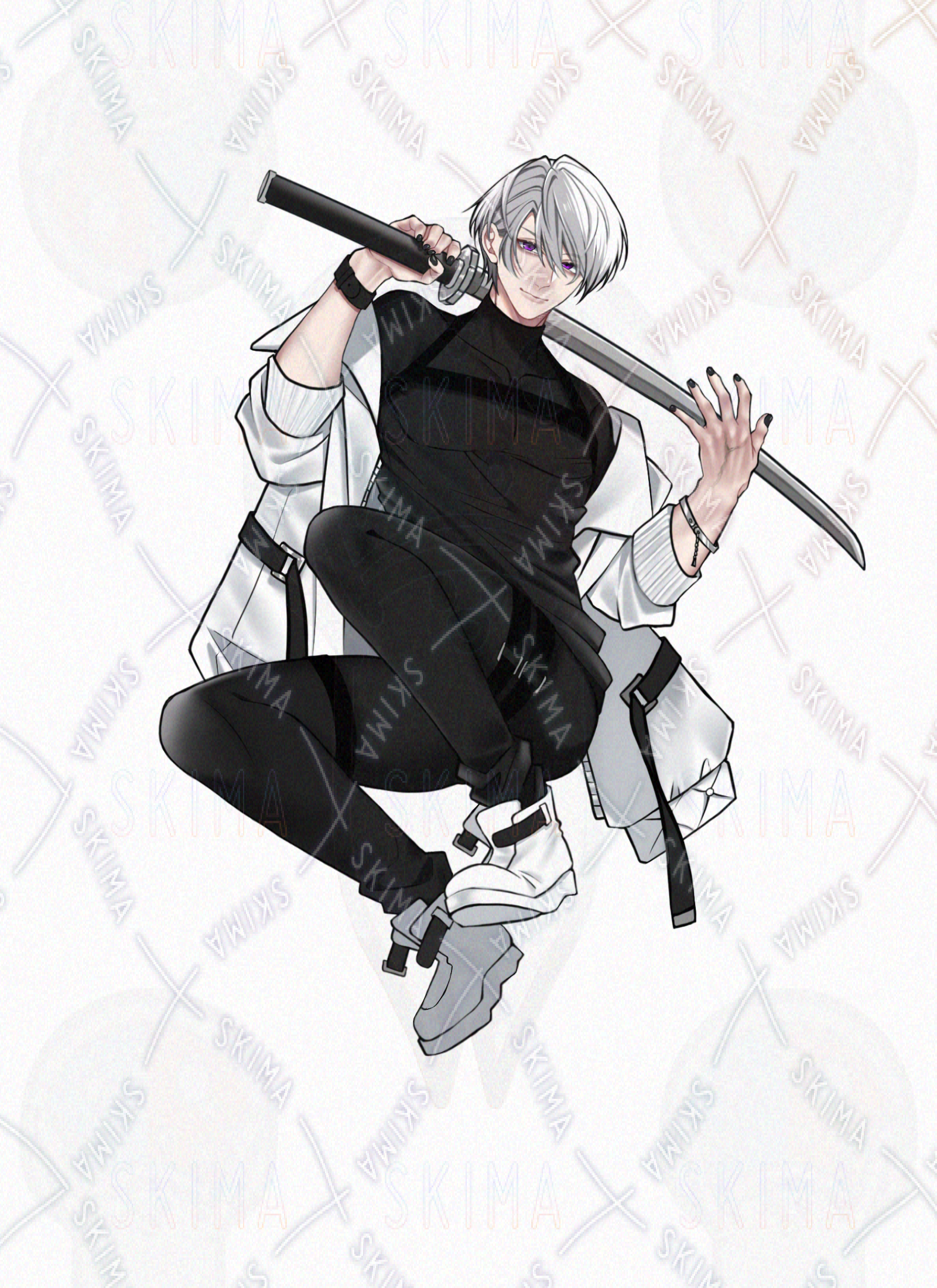 銀髪/男性/男の子/男性キャラクター/立ち絵/TRPG/全身/短髪/黒ネイル/タクティカル風/サイバー風/ハーネス/刀/戦闘/服装差分/ポーズ差分/モノクロ/紫目/双子/兄弟