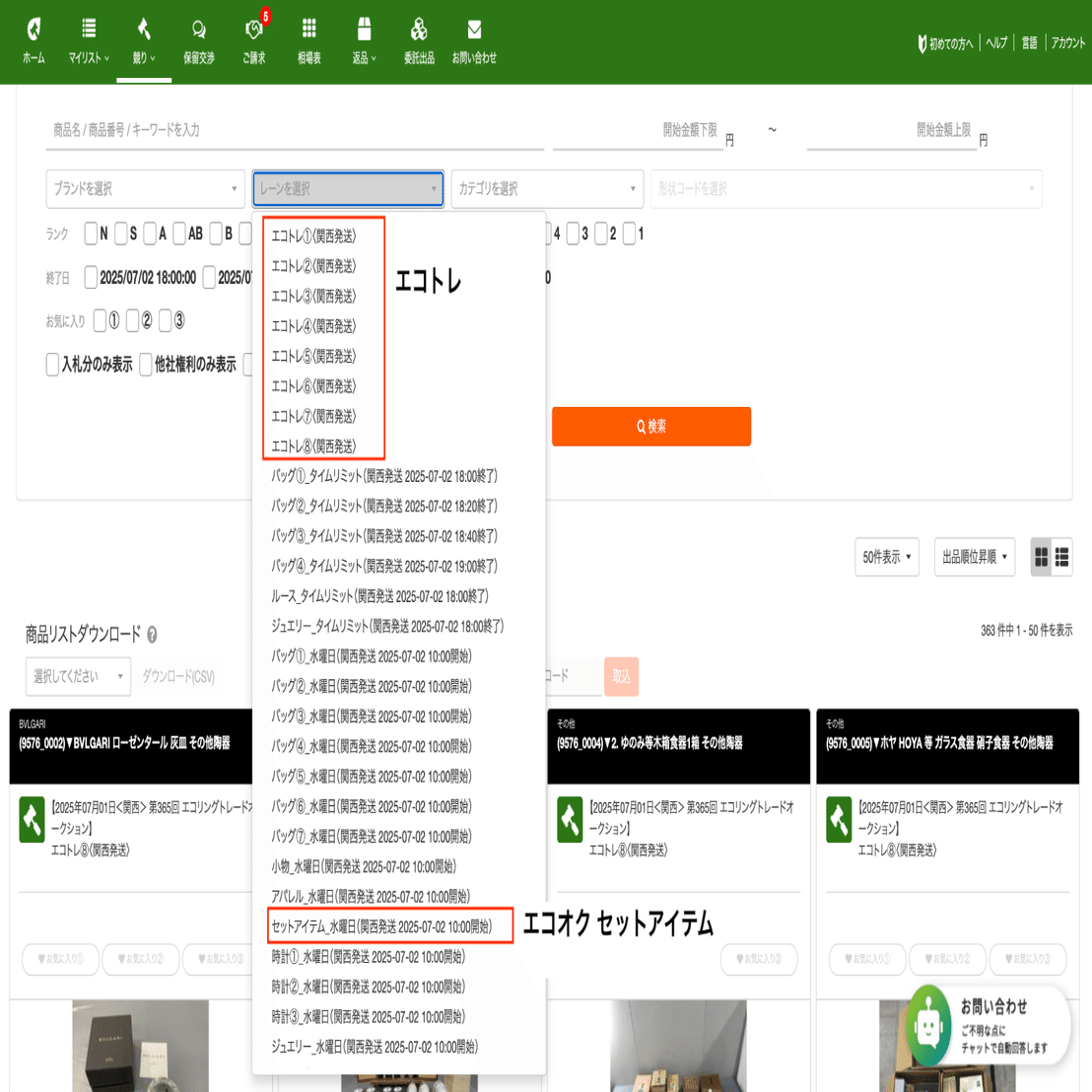 エコオクはセットアイテムのみチェック。