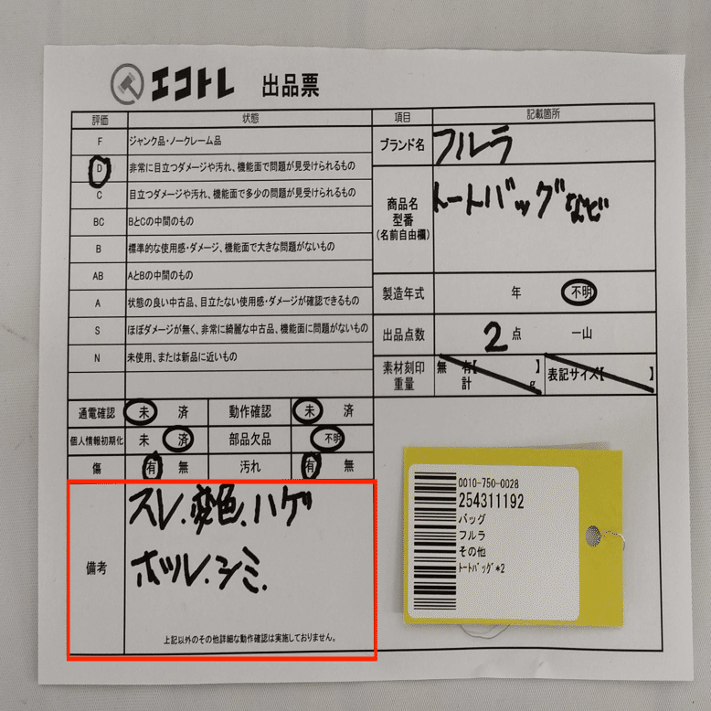エコトレ商品には状態が記載されている出品表の写真もあるので