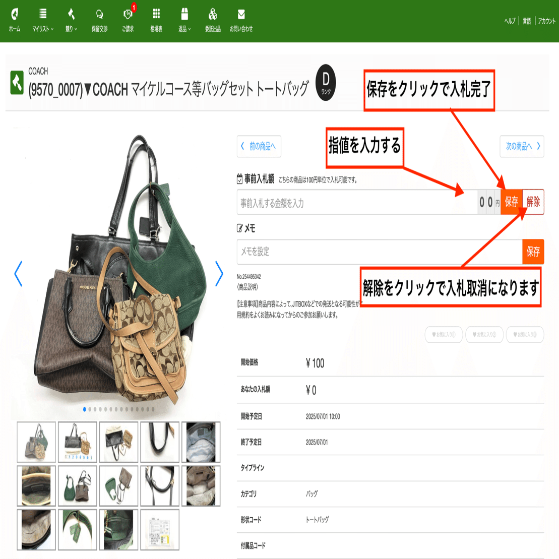 指値を入力して【保存】をクリックすると入札完了です。
