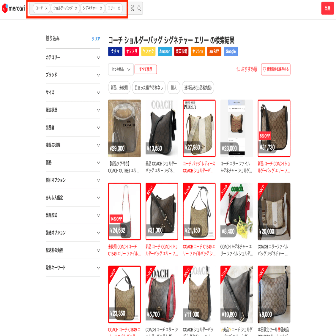 検索窓にコピペしてメルカリ内の同じバッグを探していきます。