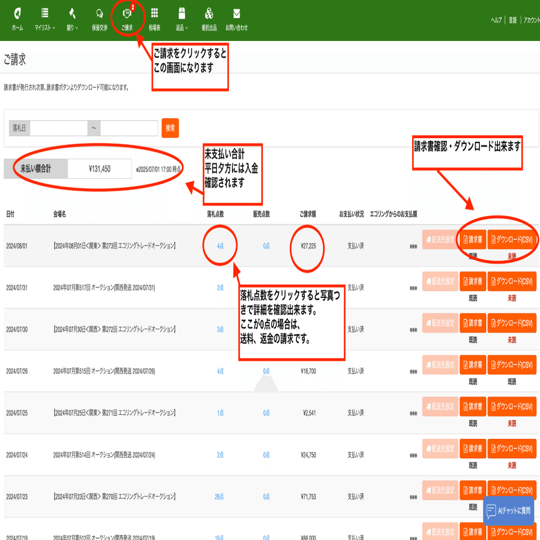 ⑨落札の見方・請求書の確認
