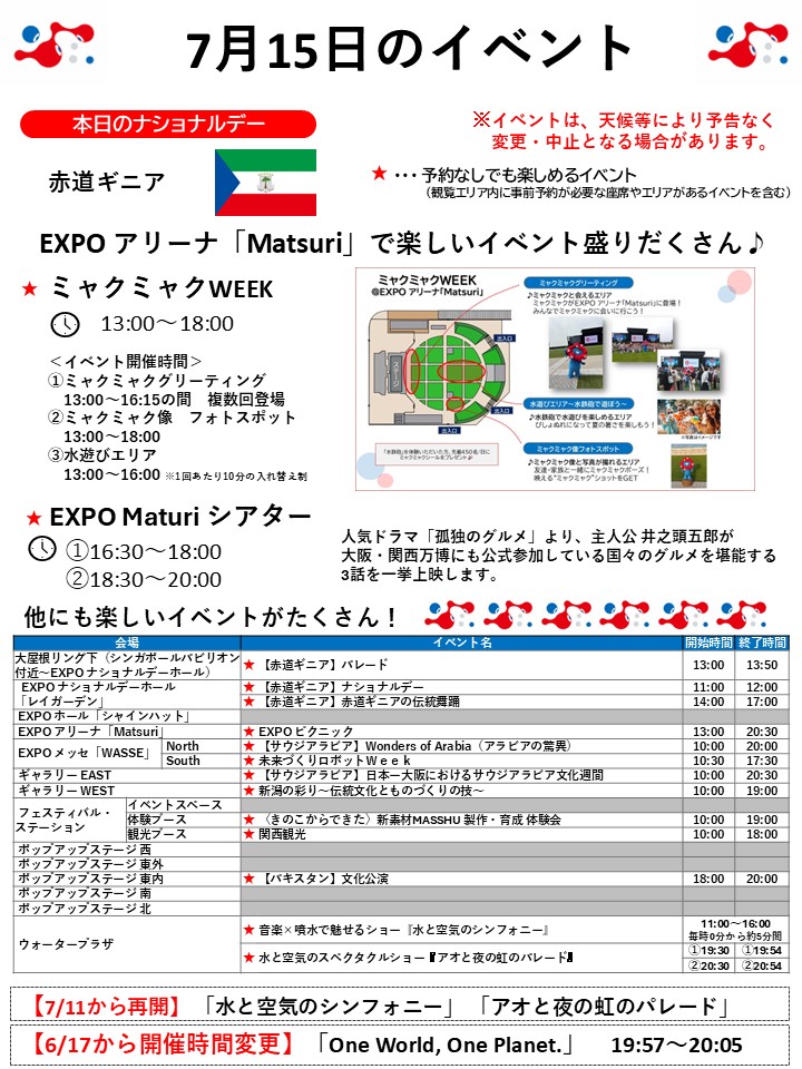 7月15日(火)の万博情報です