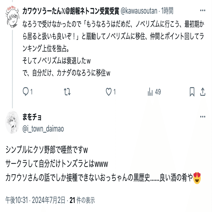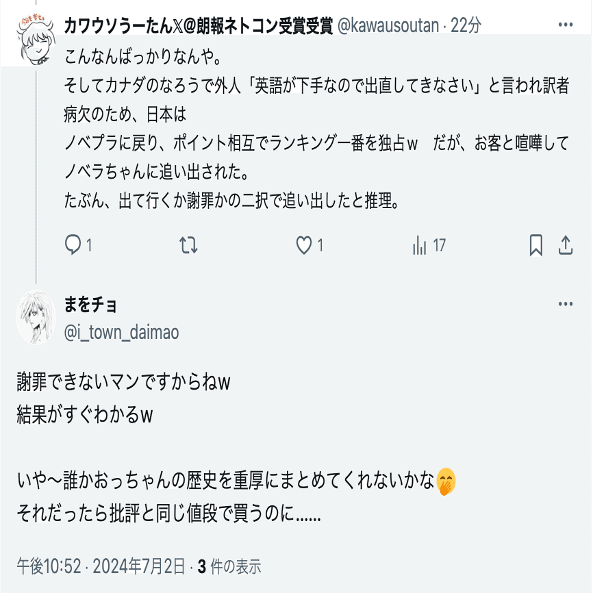 アカウントを復活させるつもりはないと思われるため、名興文庫が記録した投稿を公開し、情報提供を呼びかけると共に、名興文庫が問題視しているまを氏(@i_town_daimao)の投稿を公開し、名興文庫が受けている誹謗中傷の現状を可視化する。