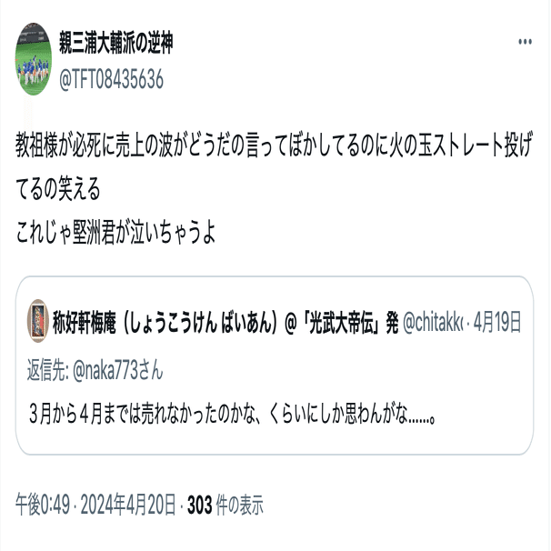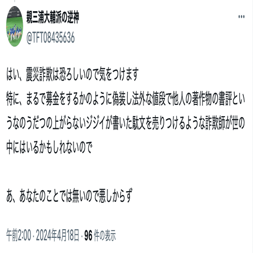 本記事では、名興文庫が問題視している親三浦大輔派の逆神(@TFT08435636)の投稿を公開し、名興文庫が受けている誹謗中傷の現状を可視化する。