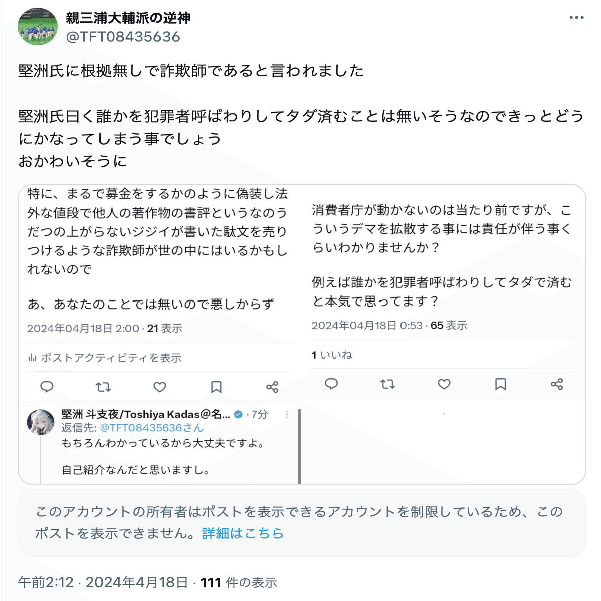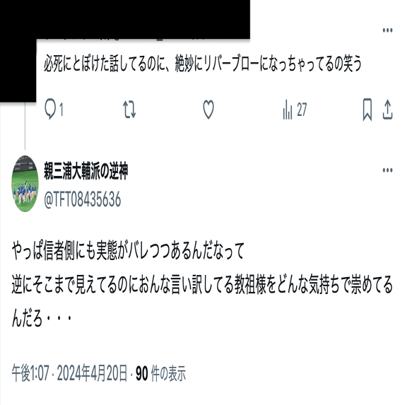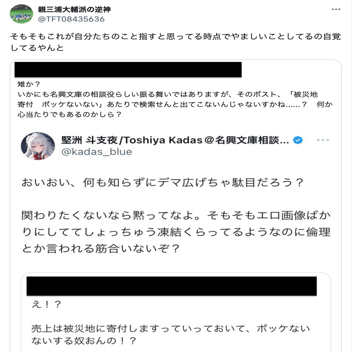 親三浦大輔派の逆神(@TFT08435636)の誹謗中傷投稿は数が多いことから、分割して公開する。