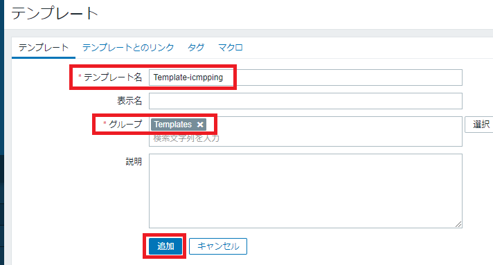 テンプレート名「Template-icmpping」、グループ「Templates」を記入し「追加」ボタンをクリックします。