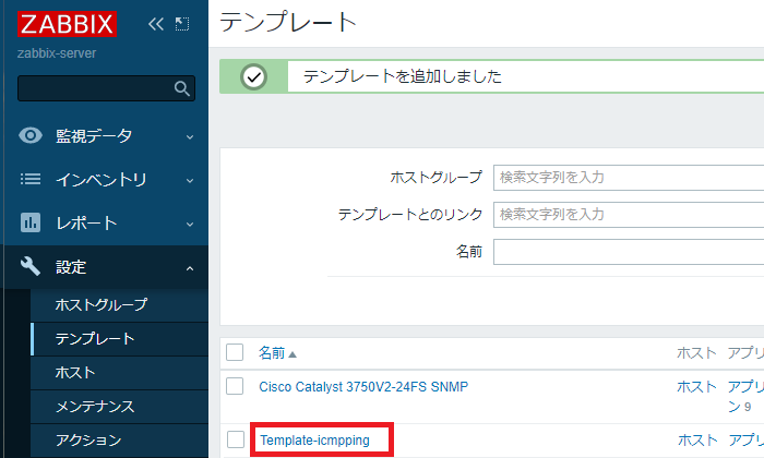 作成されたテンプレート「Template-icmpping」のリンクをくりっくします。