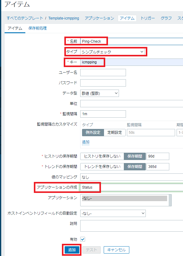 名前「Ping-Check」、タイプ「シンプルチェック」、キー「icmpping」、アプリケーション「Status」とし、「追加」ボタンをクリックします。