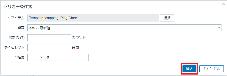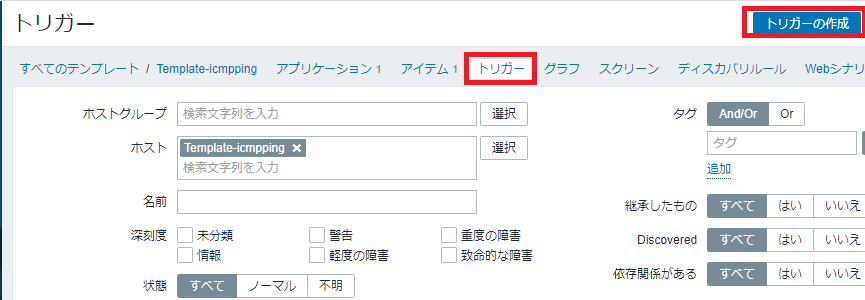 - テンプレートを作成し、監視アイテムとして ping 監視、トリガーとして「深刻度:重度の障害」を設定
