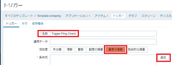 名前「Trigger-Ping-Check」、深刻度「重度の障害」とし、条件式の「追加」ボタンをクリックします。