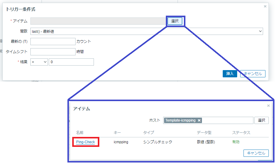 アイテムの「選択」ボタンをクリックすると先ほど作成したアイテム「icmpping」が表示されますのでそのリンクをクリックします。