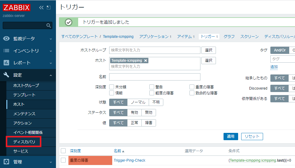 トリガーが追加されました。次に左ペイン「ディスカバリ」をクリックします。