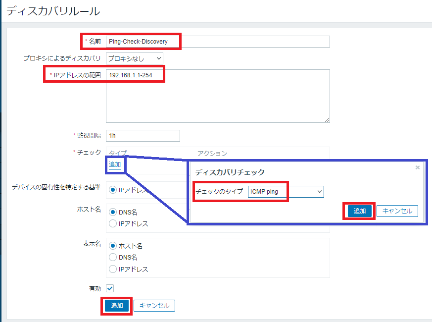 名前「Ping-Check-Discovery」、IPアドレスの範囲「(監視対象として登録したい機器の存在する IP アドレスレンジ、ここでは 192.168.1.1 ~ 254)」、チェックの「追加」リンクをクリックし、ディスカバリチェックのチェックのタイプとして「ICMP ping」を選択し、「追加」ボタンをクリックします。画面が戻り、さらに最下部の「追加」ボタンをクリックします。
