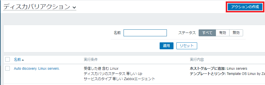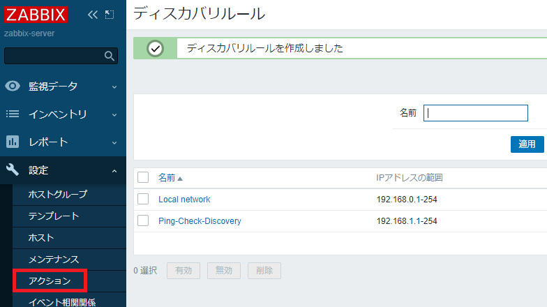 ディスカバリルールが作成されました。これにより Ping の探索は始まりますが、その探索として見つかったホストを自動登録するにはアクション設定が必要です。左ペインの「設定」⇒「アクション」をクリックします。
