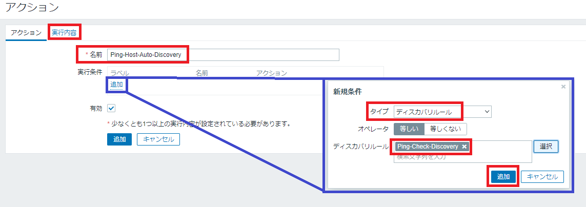 名前「Ping-Host-Auto-Discovery」、実行条件の「追加」リンクをクリックし新規条件にてタイプ「ディスカバリルール」、オペレータ「等しい」、ディスカバリルール「Ping-Check-Discovery」を選択し「追加」ボタンをクリックし、最後に上部ペインの「実行内容」をクリックします。