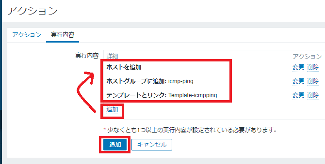 「追加」リンクをクリックし、以下のように 3 つの実行内容を追加します。これによりディスカバリルールで見つかった機器が「ホストとして追加」され、そのホストに「ホストグループ: icmp-ping」と「テンプレート: Template-icmpping」が自動で追加されます。