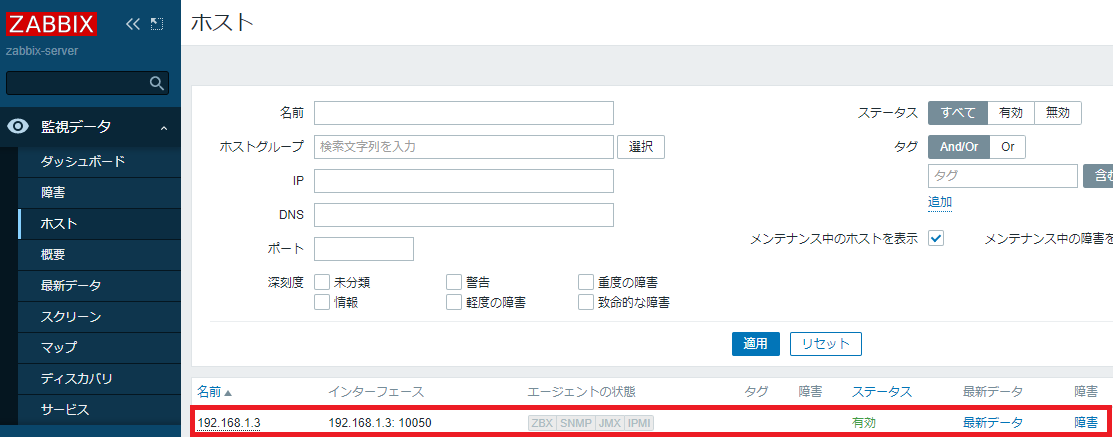 1時間ほど待ち左ペイン「監視データ」⇒「ホスト」を見ると、以下のようにホストが自動で登録されてきているのが分かります。(待ちきれない場合はディスカバリルールの監視間隔を一時的に「5m」などに変更。)