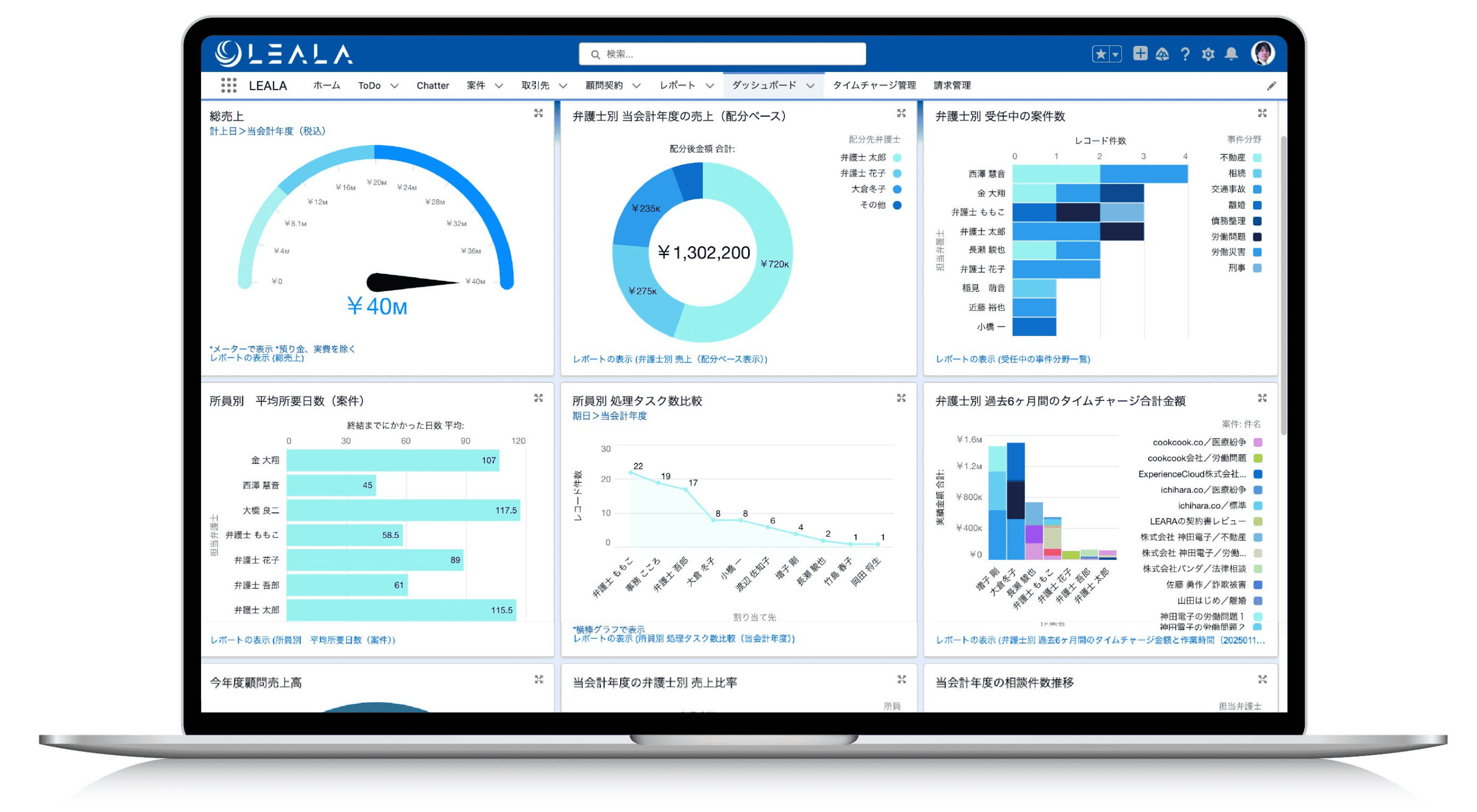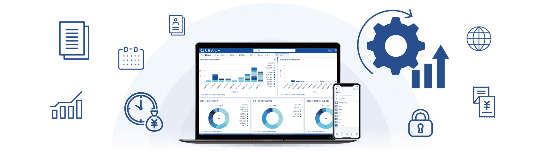 Salesforceによる世界最高峰の技術基盤と、実務経験15年以上の現役弁護士の知見が融合。法律事務所の収益や依頼者満足度など、成果を最大化する完成度の高い機能をご提供。さらに、継続的に機能が進化していきます。