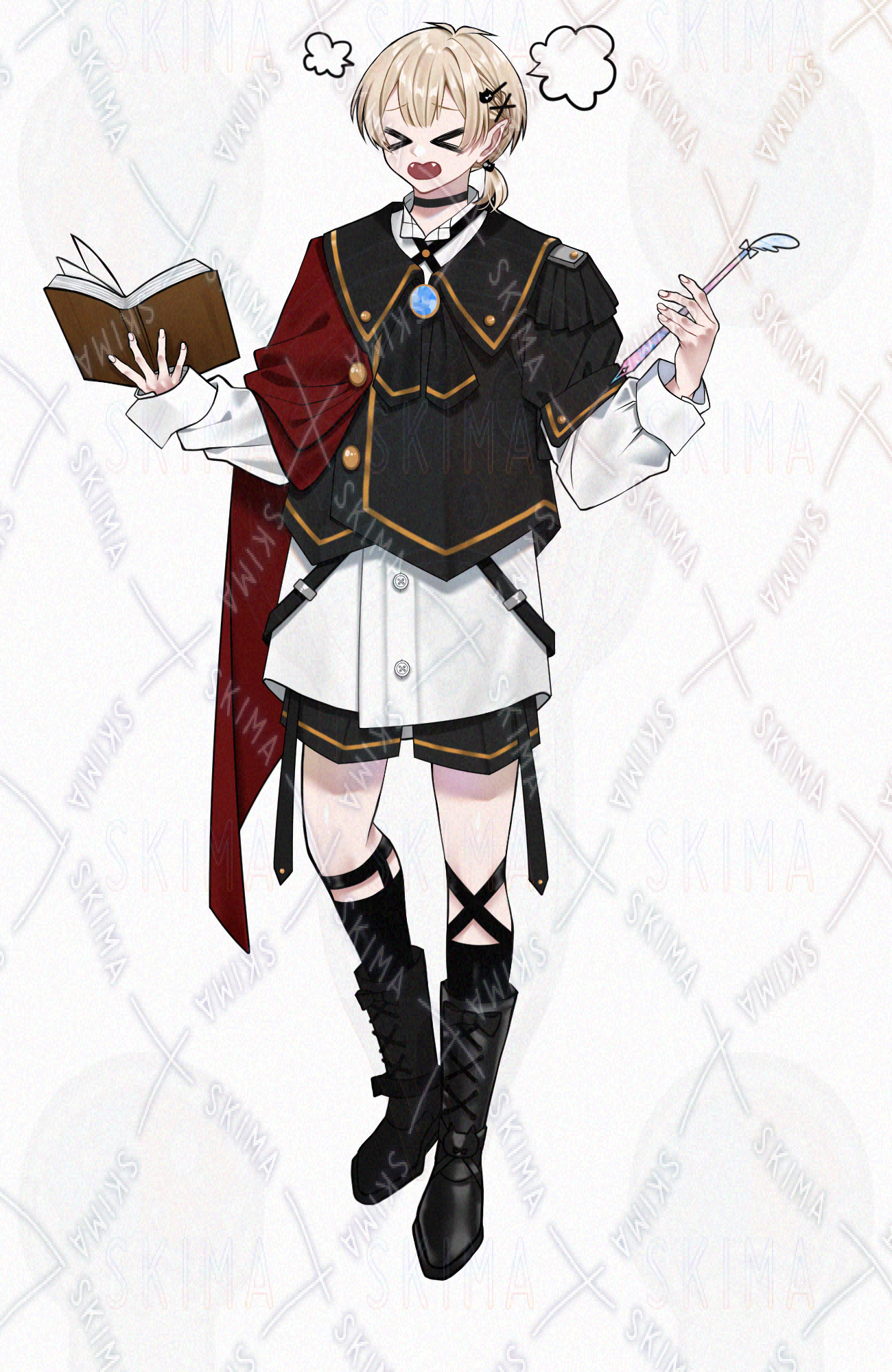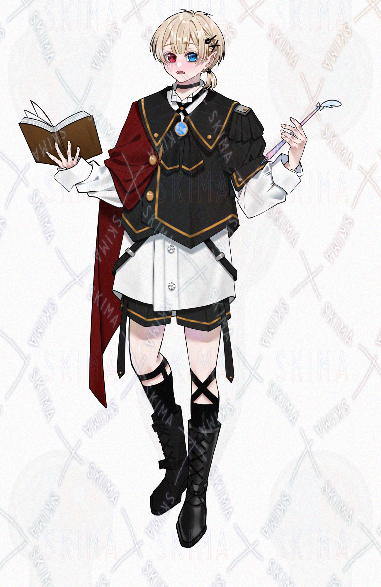 男性/男の子/男性キャラクター/立ち絵/TRPG/全身/金髪/短髪/少年/魔法使い/制服/軍服風/研究/オッドアイ/ショートパンツ/使い魔/本/猫/フクロウ