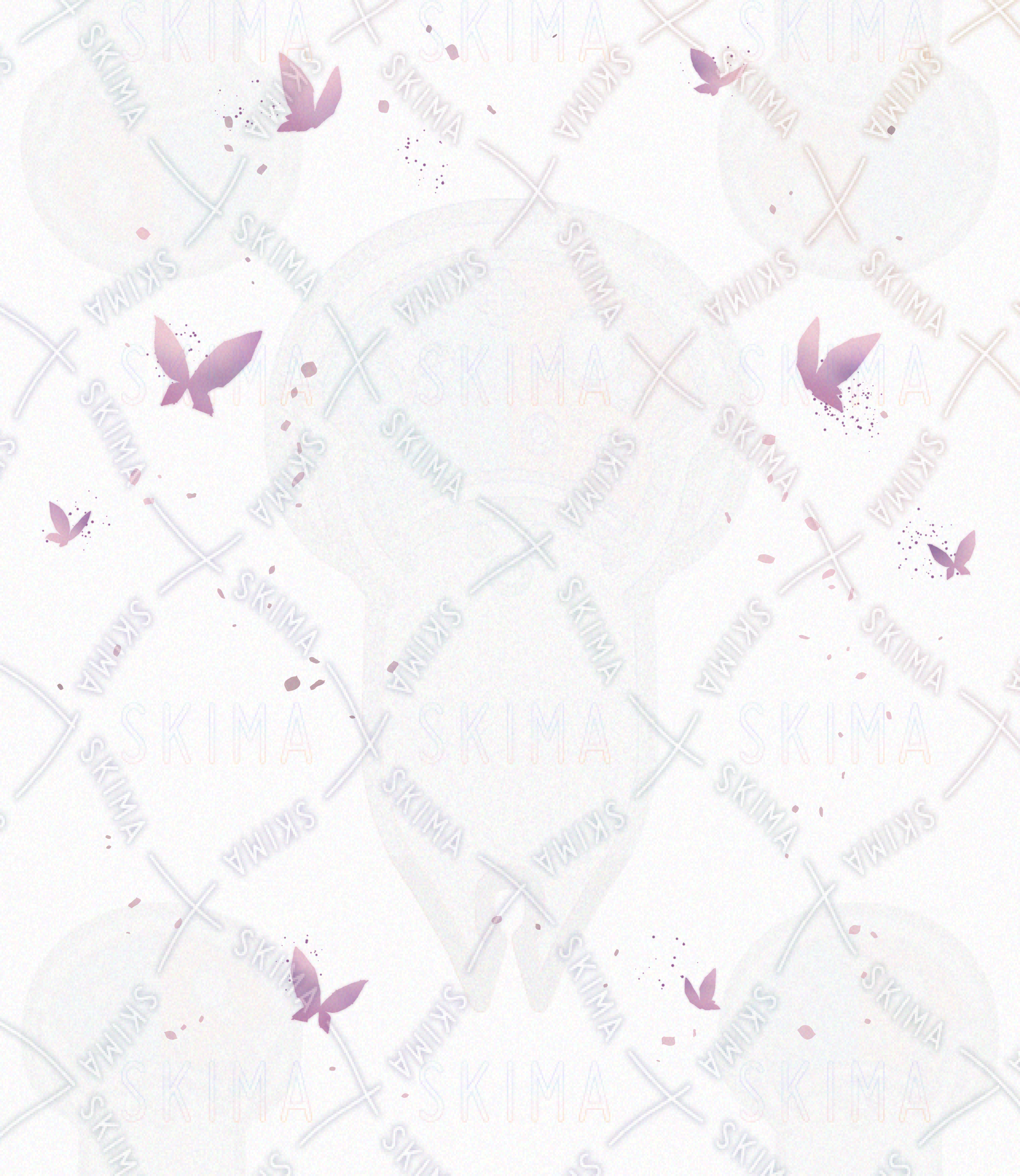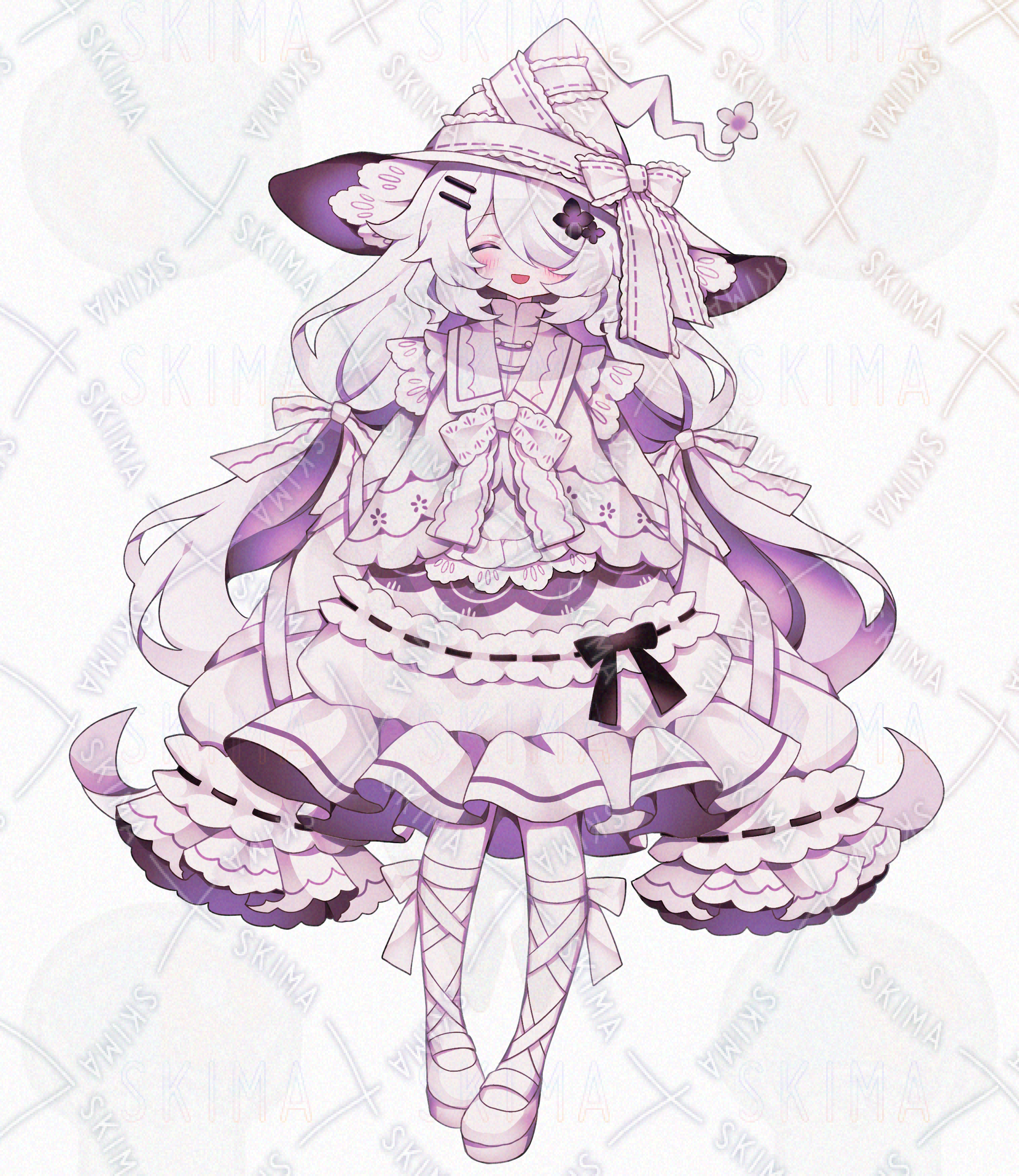 かわいい/女の子/美少女/白髪/ロングヘア/ピンク/紫/ファンタジー/リボン/隠れ目/不気味/メカクレ/レース/フリル/蝶/花/魔法使い/