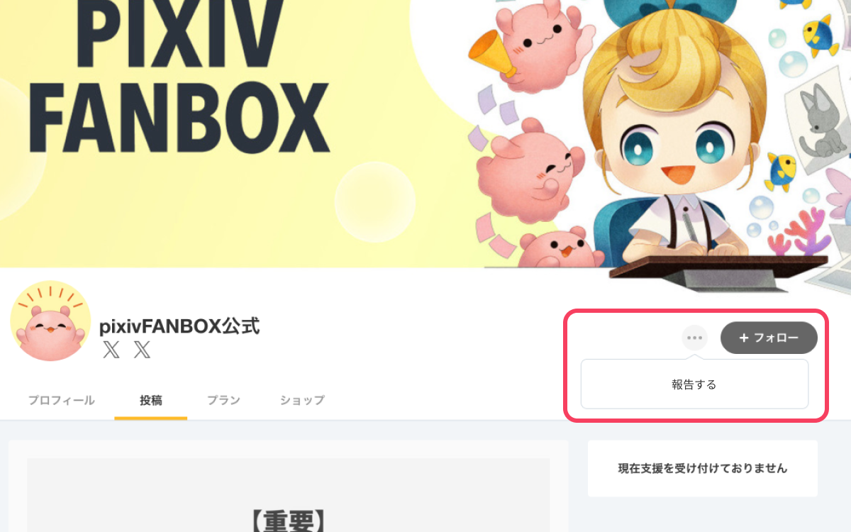 FANBOXの運営元に報告したいクリエイターのクリエイターページにある「・・・」から「報告する」を選択し、報告内容の詳細をフォームから送信してください。