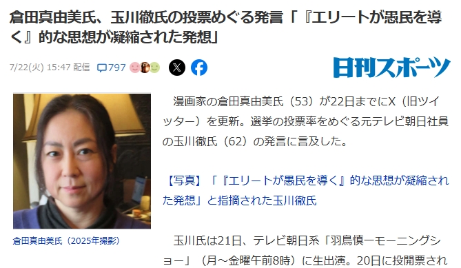 漫画家の倉田真由美氏(53)が22日までにX(旧ツイッター)を更新。選挙の投票率をめぐる元テレビ朝日社員の玉川徹氏(62)の発言に言及した。