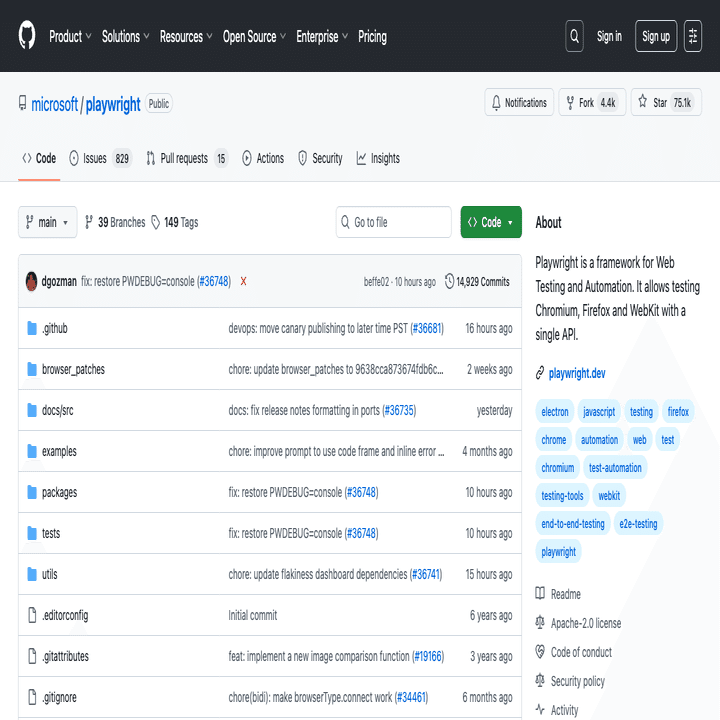 playwrightを使ってブラウザで「https://github.com/microsoft/playwright」を開いて