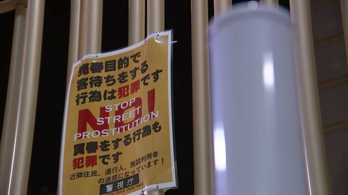 フェンスには、「客待ち」も「買春」も、いずれも「犯罪です」と示すポスターも貼られていますが、取材に訪れた記者に対しても…
