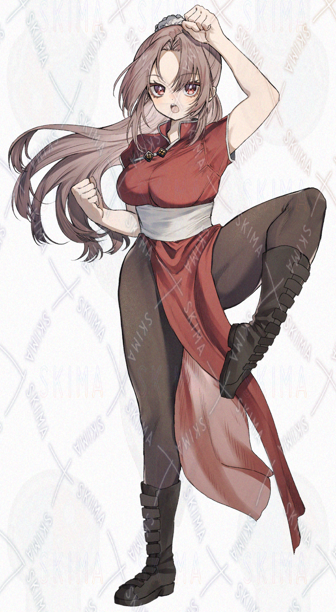 ポニーテール、赤い中華服のカンフーな女の子・女性です。キャラ設定はご自由に。
