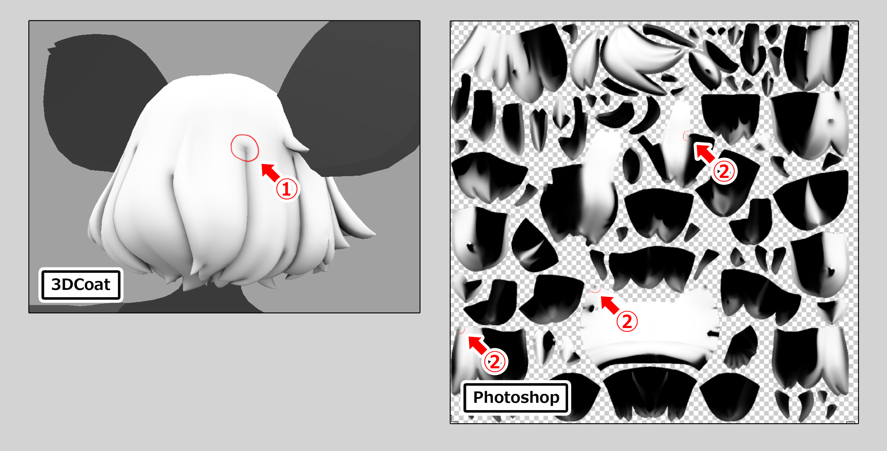UVを見てみると、3DCoat上でつけた赤丸を見てもわかるように、UV領域をまたいでいる【下図②↓】ので、Photoshopで直すのは時間がかりそうです。ここで3DCoatの「外部エディタで投影領域を編集」が役に立ちます。